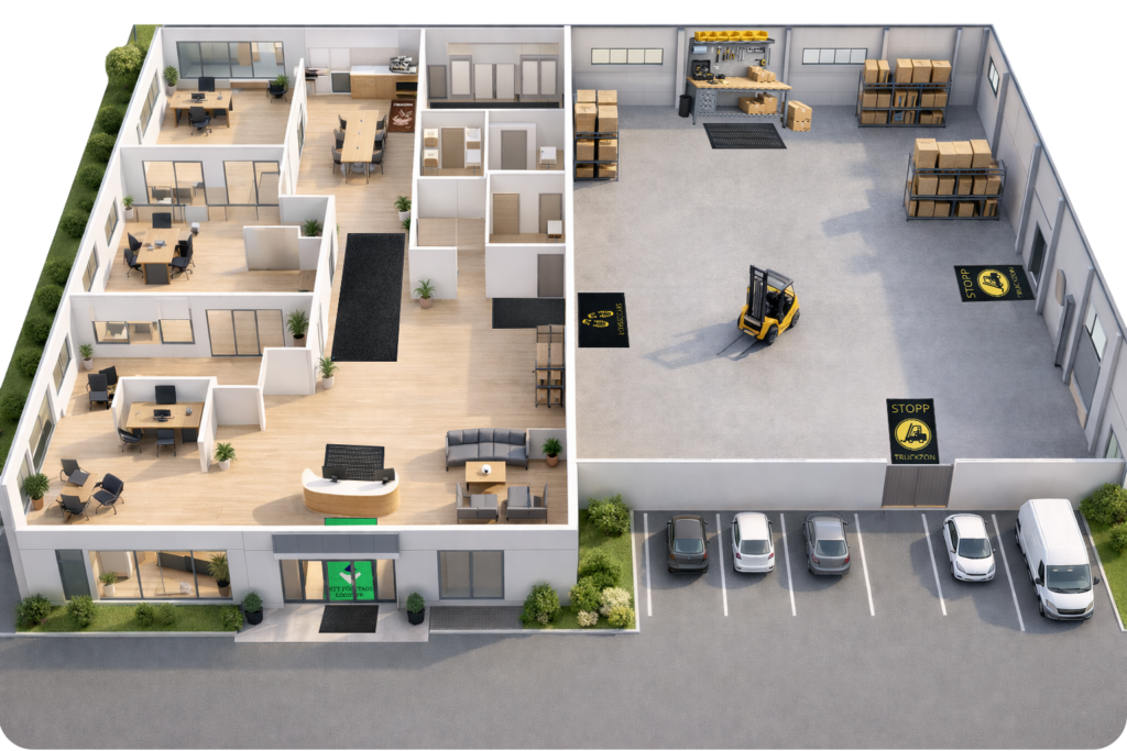 Klicka på markeringarna i bilden för att se vilken matta som passar var och varför. Här visar vi exempel på hur olika mattor kan användas för att skapa en renare, tryggare och mer genomtänkt arbetsmiljö.